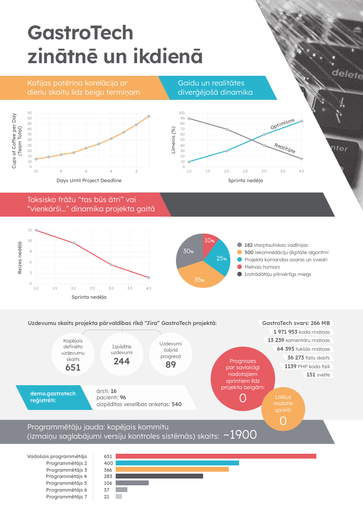 Šī infografika ilustrē GastroTech projekta attīstības dinamiku, apvienojot zinātniskus novērojumus ar ikdienas komandas darba realitāti. Tajā vizualizēta gan kafijas patēriņa pieauguma saistība ar tuvojošos termiņu, gan atšķirības starp sākotnējo optimismu un faktisko projekta progresu sprintu laikā. Infografika arī parāda biežāk lietoto frāžu ietekmi uz projekta tempu, uzdevumu izpildes statistiku, koda apjomu un komandas ieguldījumu versiju kontroles sistēmā. Kopumā tā humoristiskā, bet datos balstītā veidā atspoguļo GastroTech projekta ikdienu un izstrādes procesa realitāti.