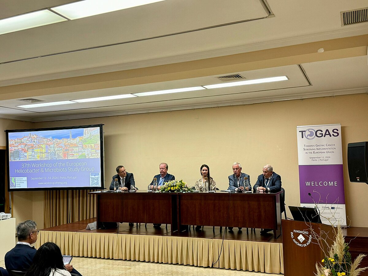 2024. gada septembris, Porto, Portugāle, projekta TOGAS otrā konference. Paneļa diskusija par kuņģa vēža novēršanas pasākumu progresu Eiropā. No kreisās: Jans Bornšeins (Jan Bornschein, Oksfordas Universitātes slimnīcas, Anglija), Bojans Tepešs (Bojan Tepeš, NIJZ, Slovēnija), Danute Ražuka-Ebela (GASTRO CENTRS un LU, Latvija), Hendriks van Popels (Hendrik Van Poppel, PRAISE-U projekts, KU Leuven, Beļģija), Mārcis Leja (LU un GASTRO CENTRS, Latvija).