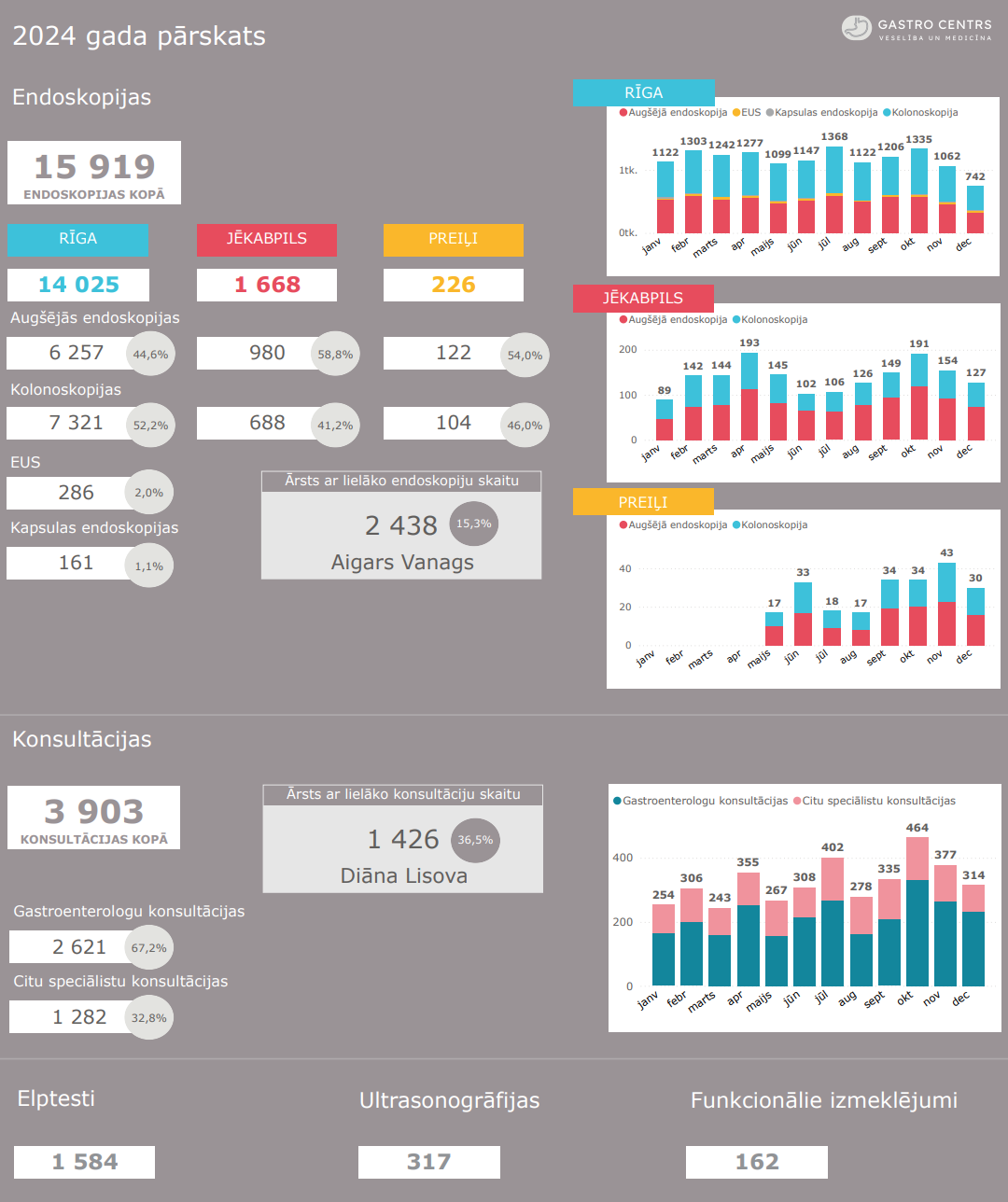 Infografikā attēlots GASTRO CENTRA 2024. gada pārskats, kurā redzama plaša informācija par veiktajām endoskopijām, konsultācijām un papildu izmeklējumiem trīs filiālēs – Rīgā, Jēkabpilī un Preiļos. Kopumā gada laikā veiktas 15 919 endoskopijas, no kurām visvairāk – 14 025 – veikts Rīgā. Biežāk izmantotās endoskopijas bija kolonoskopijas (52,2%) un augšējās endoskopijas (44,6%). Lielākais endoskopiju skaits – 2438 – ārstam Aigaram Vanagam.